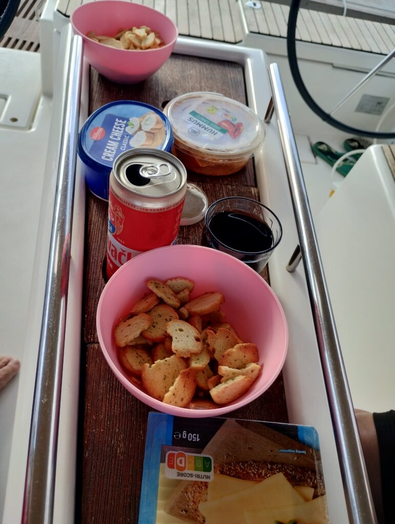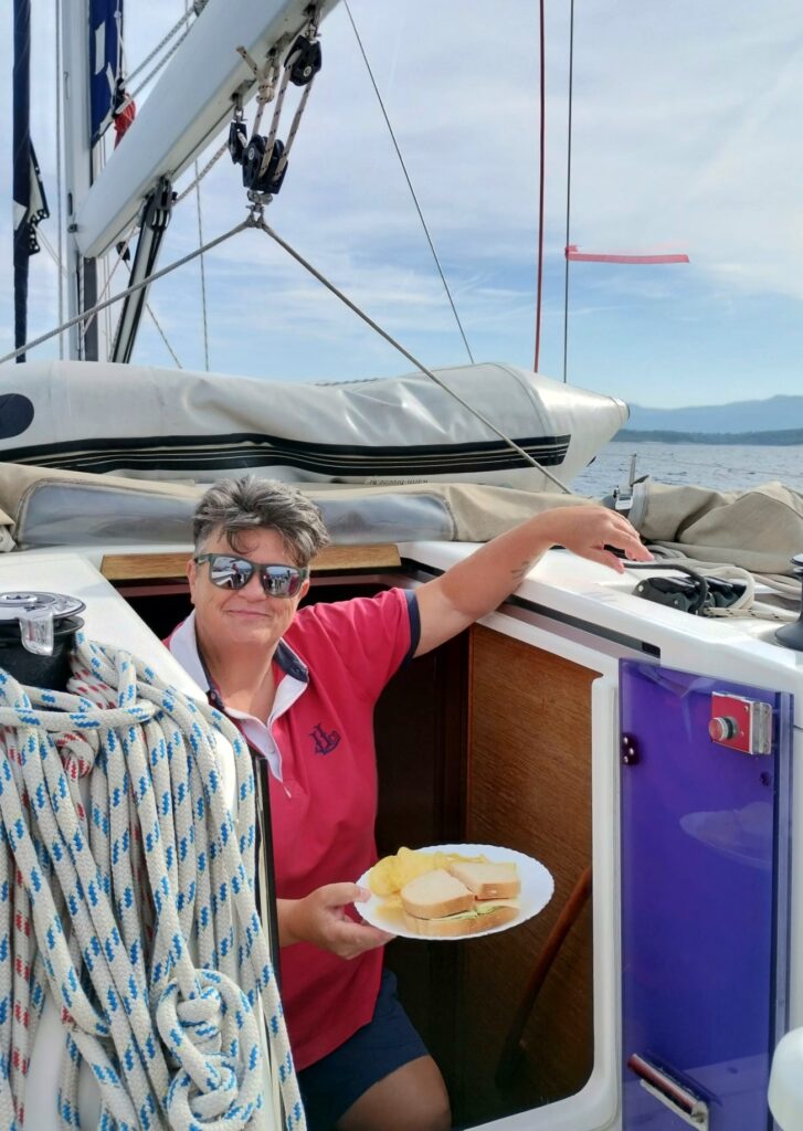 Sileb is fitted with in-mast furling and self tacking jib. It’s almost like driving an automatic car! It’s sailing the easy and lazy way and ideal for sailing with just the two of us. It made life easy for the sandwich chef to rustle up some lunch.