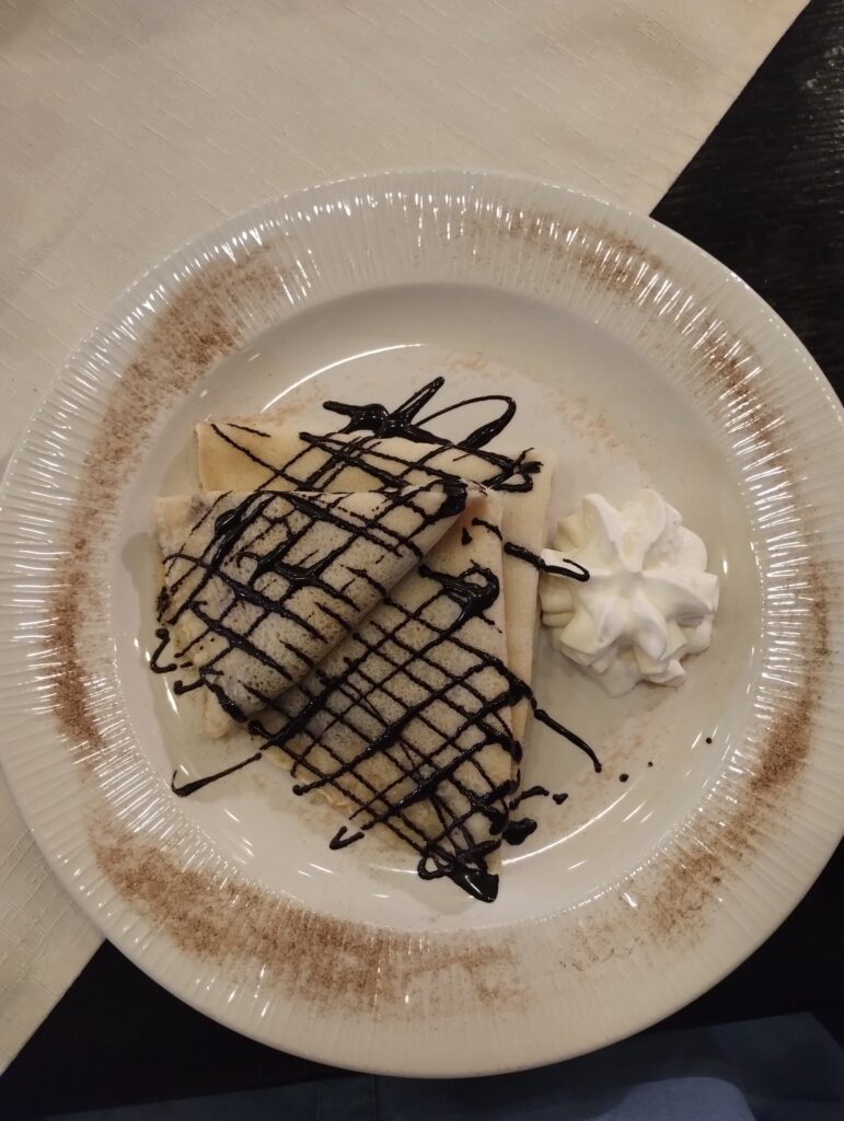 Alison decided to try the Nutella crepe and dessert wine before we wandered back to the boat and to try and walk our dinner off!