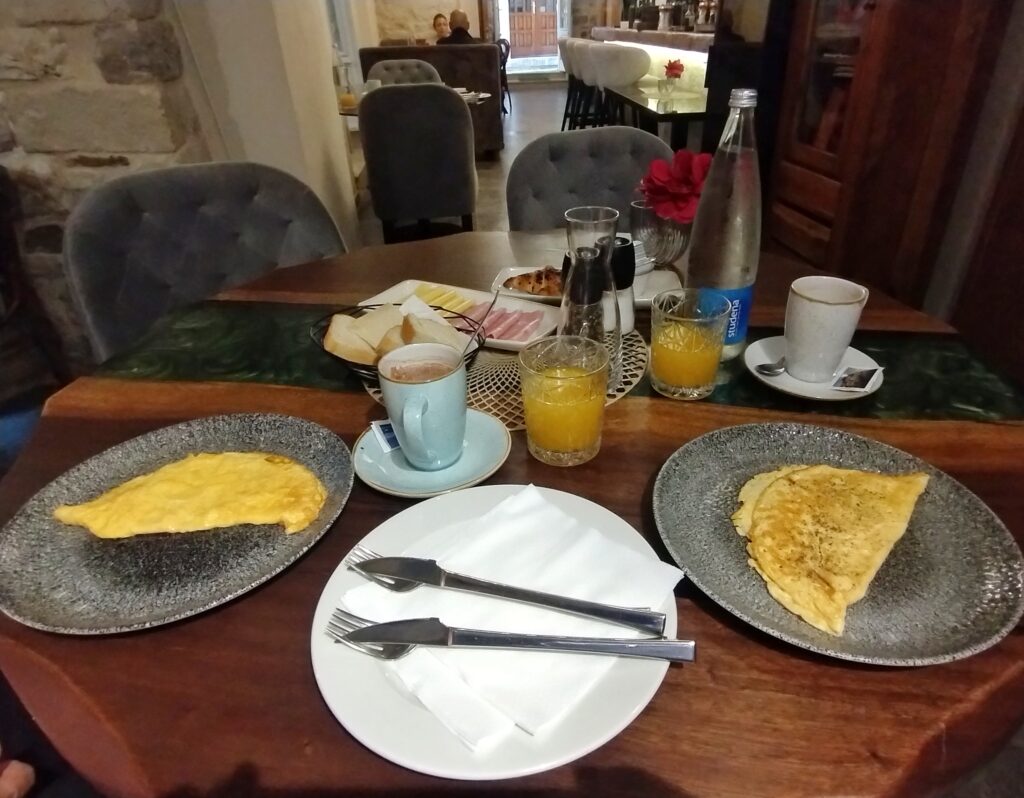 We slept like logs and looked forward to another lovely breakfast, this time inside due to torrential rain! And what a feast! Omelette, cheese, bread, pastries…a very generous helping of goodies. Plenty of food to send us on our way.